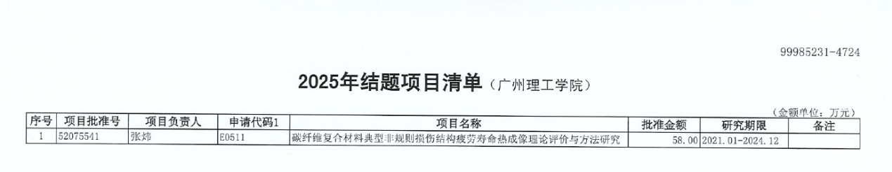 近日,我校接到国家自然科学基金委员会通知,智能制造与电气工程学院张炜教授主持的国家自然科学基金项目《碳纤维复合材料典型非规则损伤结构疲劳寿命热成像理论评价与方法研究》(批准号52075541),通过国家自然科学基金委员会验收,顺利如期结项。