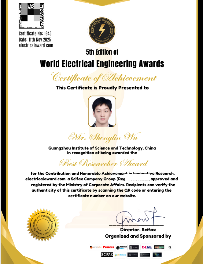 国际学术组织Scifax授予智能制造与电气工程学院吴晟霖老师“最佳研究者奖”