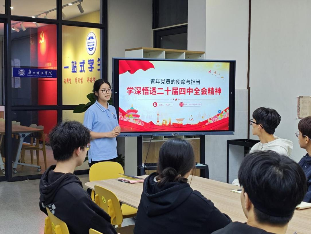 会议伊始,何玉华老师介绍,中国共产党第二十届中央委员会第四次全体会议,于2025年10月20日至23日在北京举行。何老师围绕“青年党员的使命与担当”,结合学生专业特色,向大家传达学习党的二十届四中全会精神。她指出,党的二十届四中全会准确把握“十五五”时期党和国家事业发展所处历史方位,深入分析了我国发展环境面临的深刻复杂变化,对未来五年发展作出顶层设计和战略擘画。