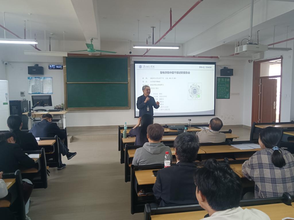 11月13日下午,智电学院中层干部述职报告会在13栋603室举行。学院院长李玉忠主持会议,学校绩效办梁云芬老师到会指导,全院教职工参会。学院7名中层干部围绕年度岗位职责、工作成效、存在问题及未来计划以PPT形式进行逐一汇报。全体教职工依据学校中层干部考核指标体系考核要求,从政治素质、履职能力、工作实绩、廉洁自律等一级指标无记名量化评分,梁云芬老师现场解读评分规则时强调:“评议结果将纳入干部个人成长档案,与评优评先、岗位调整刚性挂钩。”