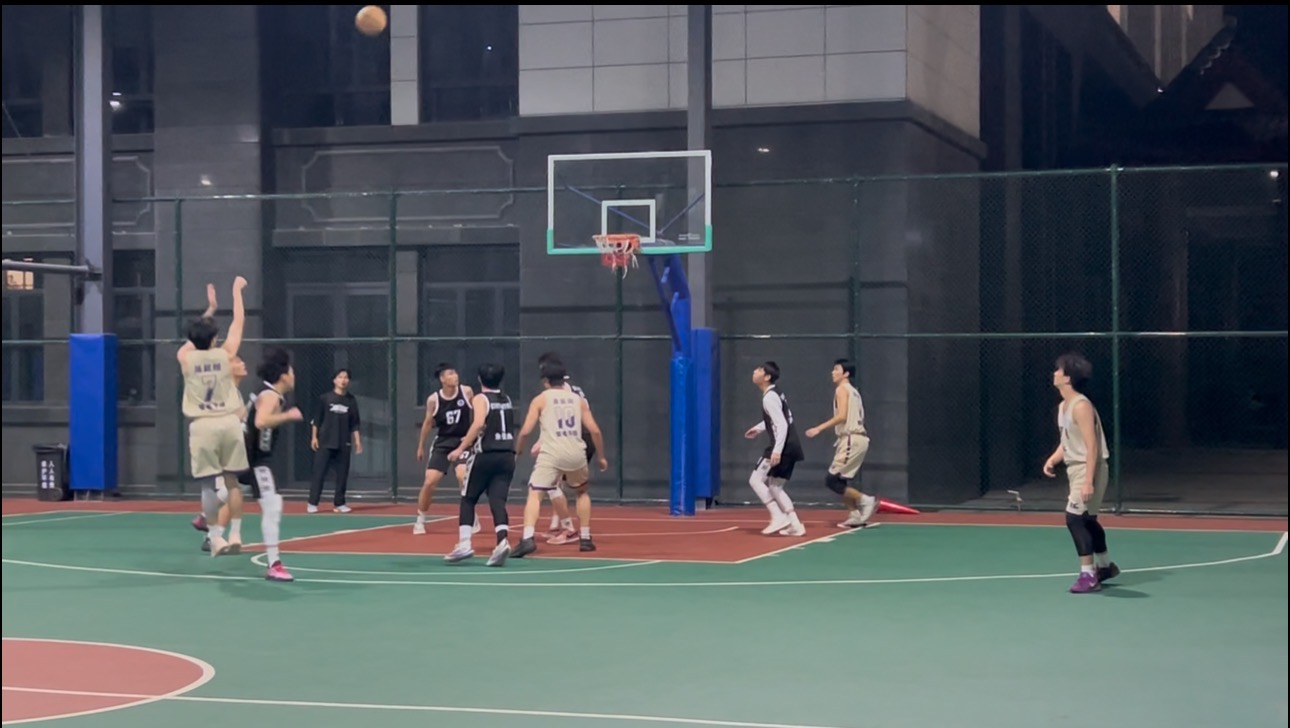 赛前半小时,智电男篮便身着浅米色队服到场热身:7号球员连续命中三分试手,1号与队友反复演练挡拆配合;航空学院男篮则以黑色队服亮相,10号内线球员频繁冲击篮下,提前适应对抗强度。场边观众陆续聚集,两院助威声已提前为比赛“升温”。