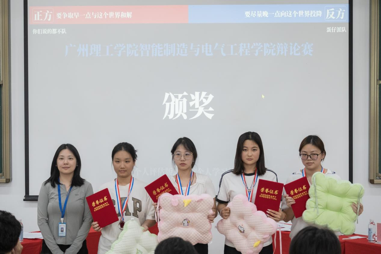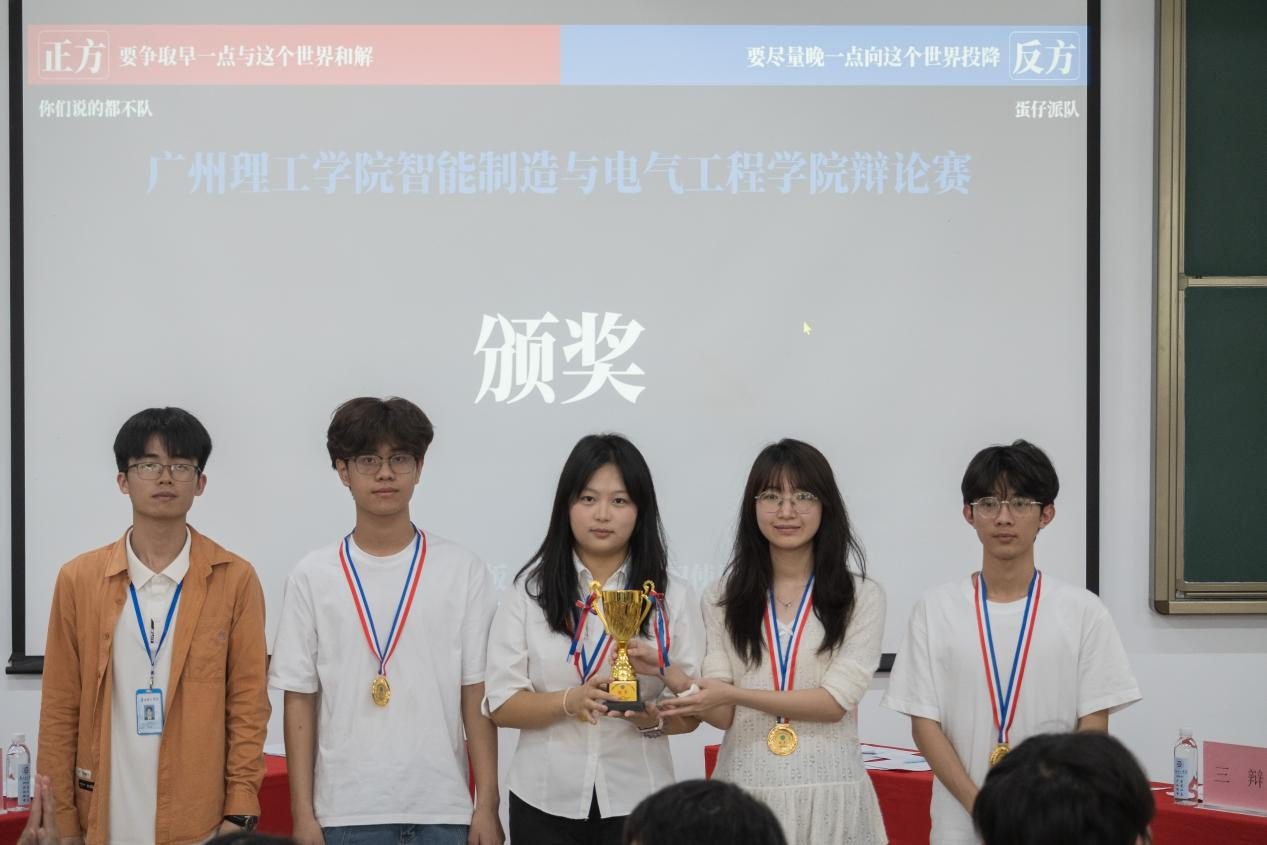 评委充分肯定双方表现,指出论点、论据与节奏上的不足并给出改进建议。经评委合议,正方队伍获得冠军,反方四辩荣获 “最佳辩手” 称号。张立都、朱颖、谢燕惠老师分别为冠军、亚军、最佳辩手颁奖并合影。