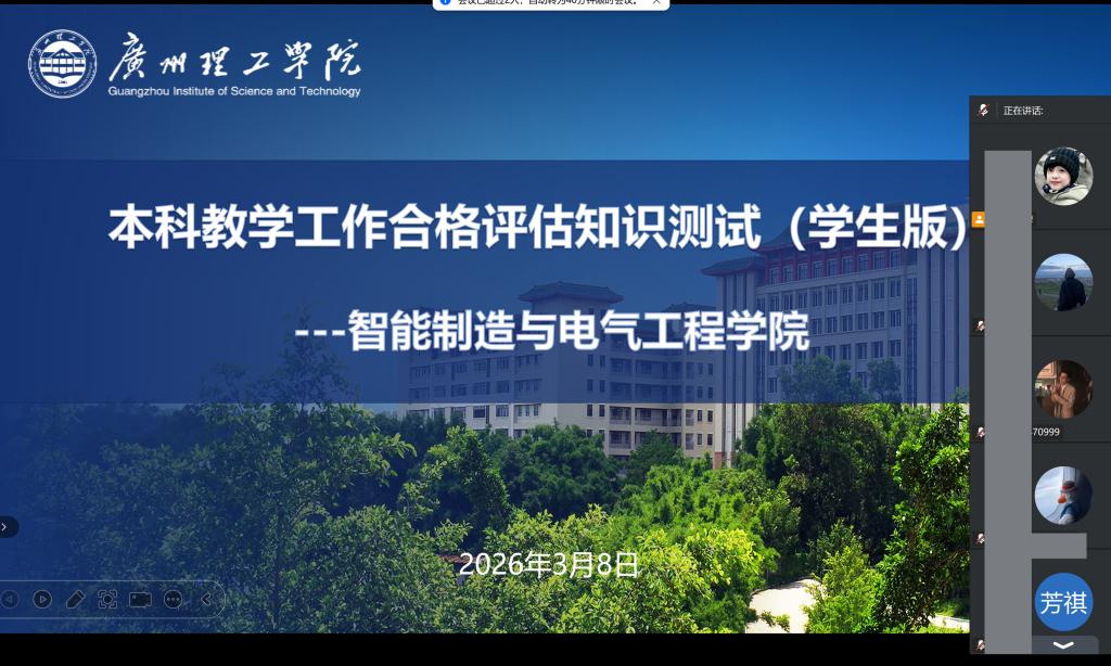 3月8日晚,智电学院通过线上会议的形式召开本科教学工作合格评估知识测试(学生版)的主题班会,辅导员和班长主讲,全体同学积极参与。