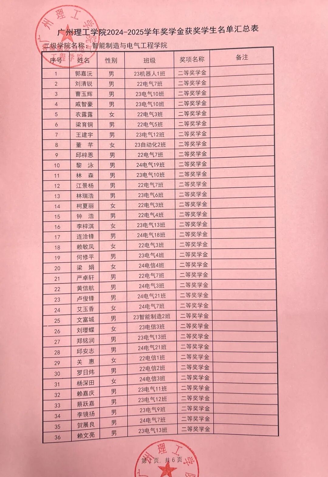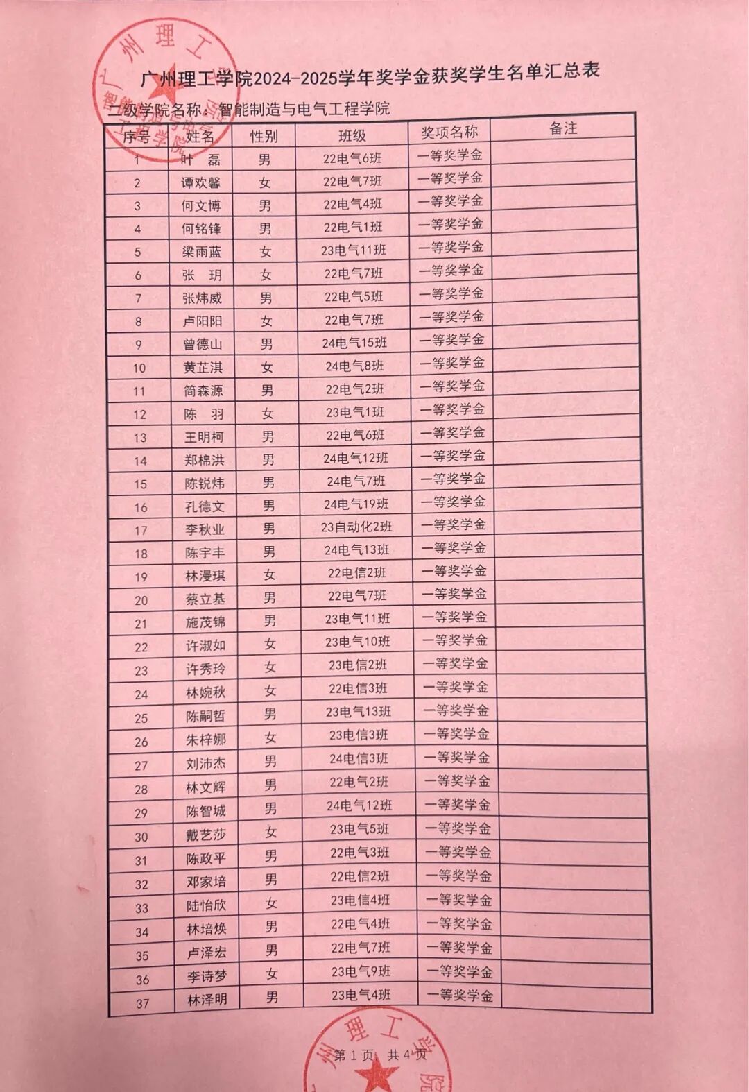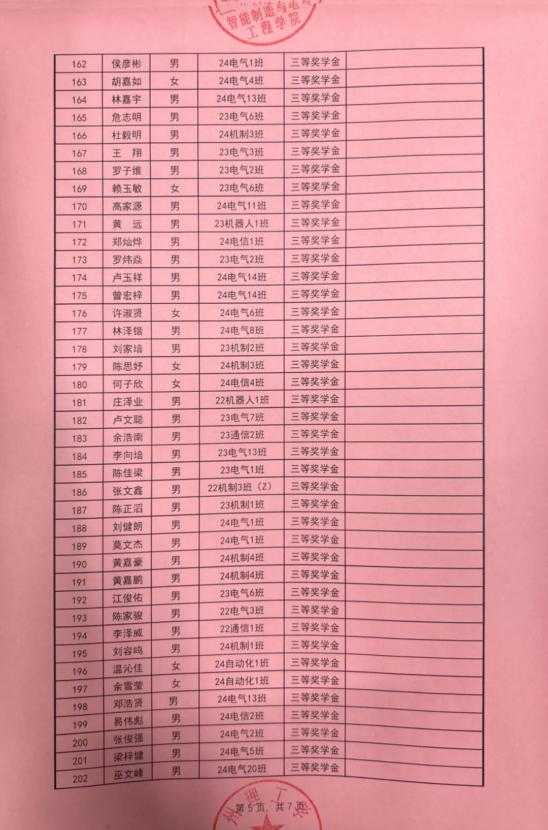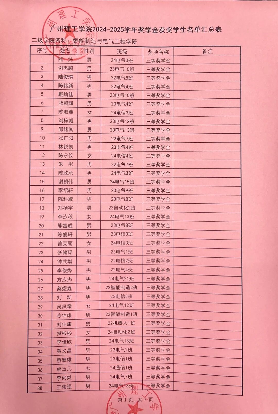 根据广州理工学院学生处关于印发《2024-2025学年奖学金评比工作方案》的通知(广州理工学函〔2025〕162号),智能制造与电气工程学院本着公平公正公开的原则对收到764份奖学金申请材料进行严格评选,现对学院2024-2025学年优秀学生奖学金拟获奖名单予以公示。公示时间从2025年9月24日至2025年9月26日。
