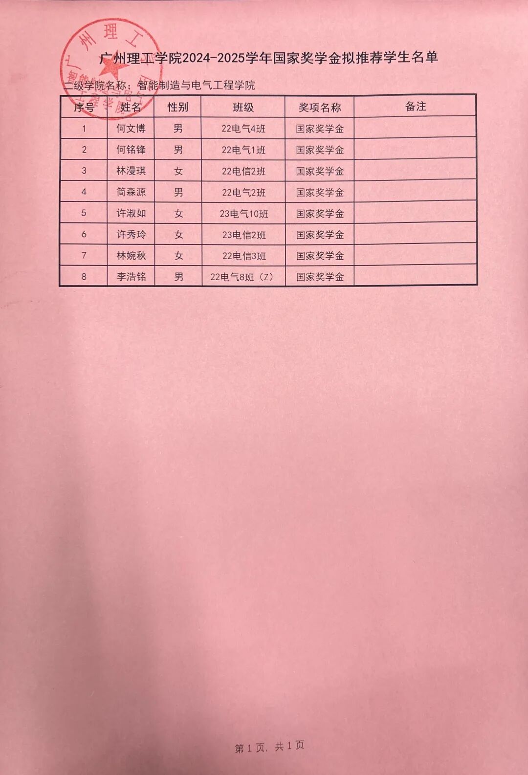 根据广州理工学函〔2025〕162号关于印发《2024-2025学年奖学金评比工作方案》的通知,现对智能制造与电气工程学院2024-2025学年国家奖学金拟推荐名单予以公示。公示时间从2025年9月24日至2025年9月26日。